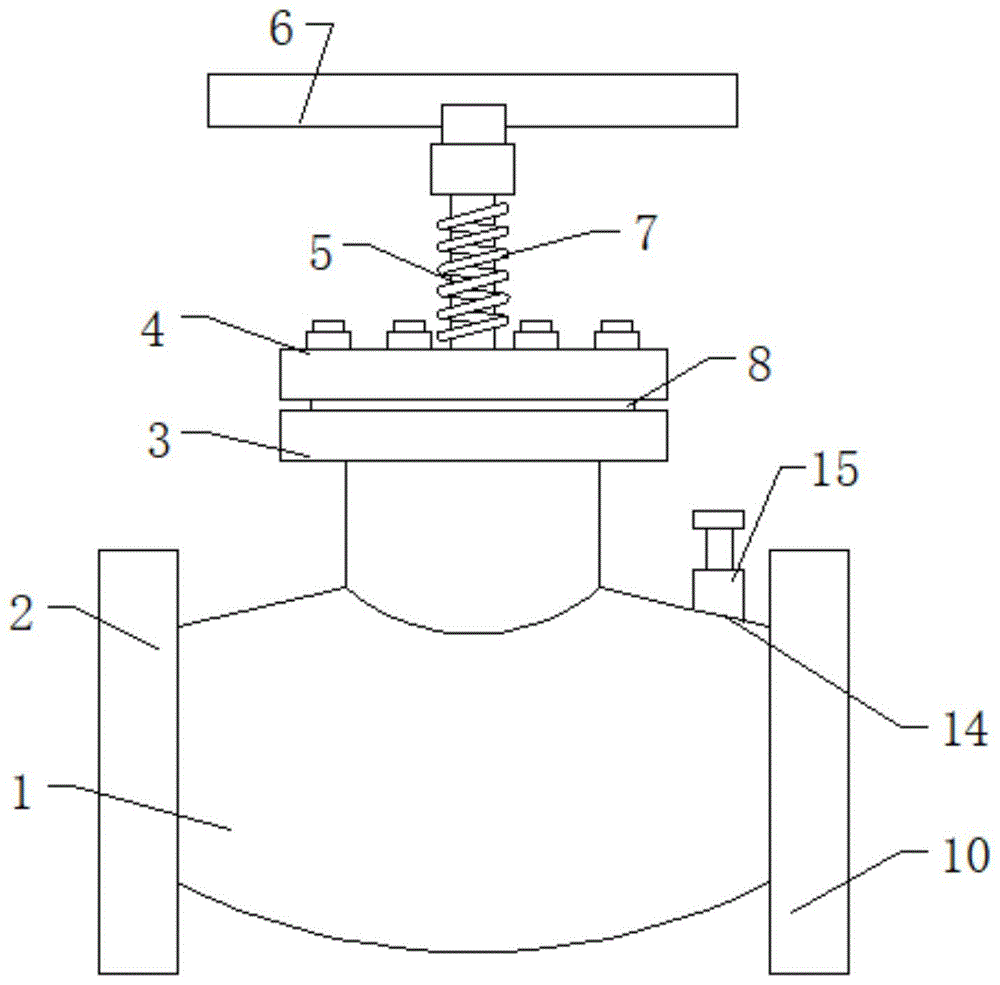 本實(shí)用新型中,第二通流盤12的底部外壁上焊接有等距離分布的兩個(gè)底座18,且兩個(gè)底座18分別位于兩個(gè)矩形槽21的正下方,通過矩形槽21插入至第二通流盤12的表面,將一列或者兩列的第二通流孔13堵住,將阻流板17插入至底座18中,從而斷開一列或者兩列的第二通流孔13,與第一通流孔20不接觸,從而減少可通過液體的通流孔個(gè)數(shù),從而減小液體的通過量,閥體1的頂部外壁上套接有固定座3,且固定座3的頂部外壁上通過螺栓固定有墊片8,墊片8的頂部外壁上通過螺栓固定有閥蓋4,且閥蓋4的頂部外壁上插接有閥桿5,閥桿5的圓周外壁上套接有彈簧7,且閥桿5的頂端套接有轉(zhuǎn)盤6,閥體1的頂部外壁靠近閥桿5的位置開有第一通孔,且閥桿5通過第一通孔與閥體1的內(nèi)部相連通,閥體1的一端通過螺栓固定有第一法蘭盤2,且閥體1遠(yuǎn)離第一法蘭盤2的一端通過螺栓固定有第二法蘭盤10。